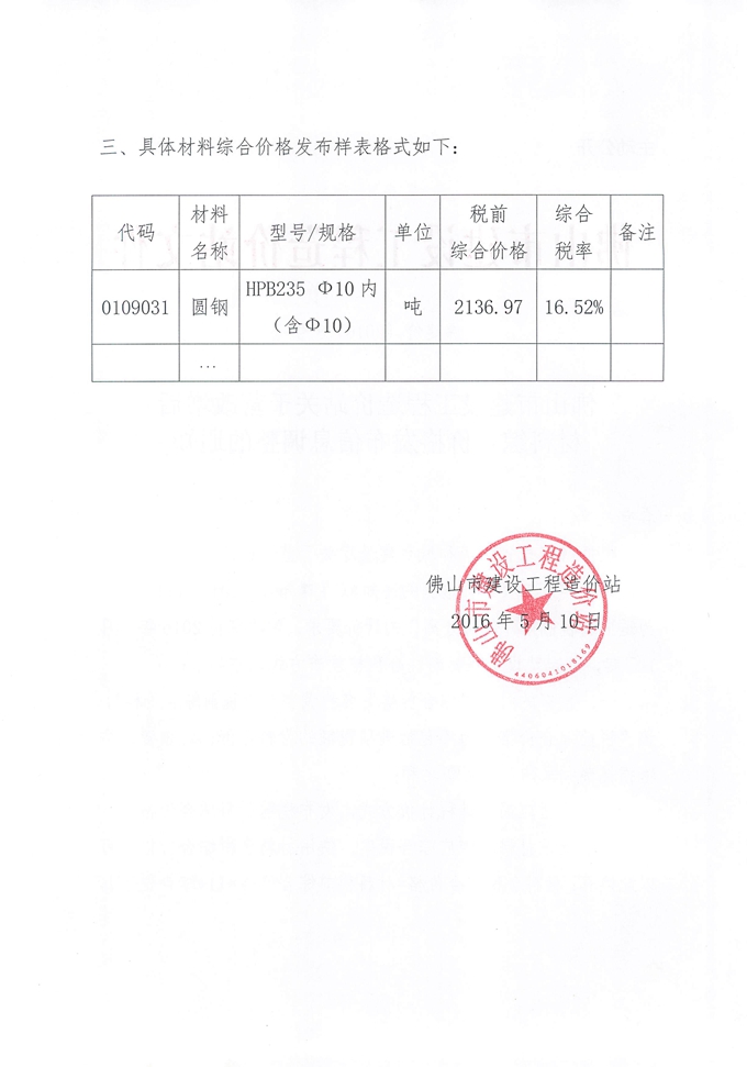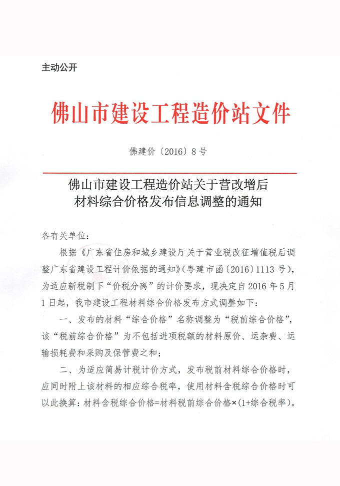 佛山市建設(shè)工程造價站關(guān)于營改增后材料綜合價格發(fā)布信息調(diào)整的通知
