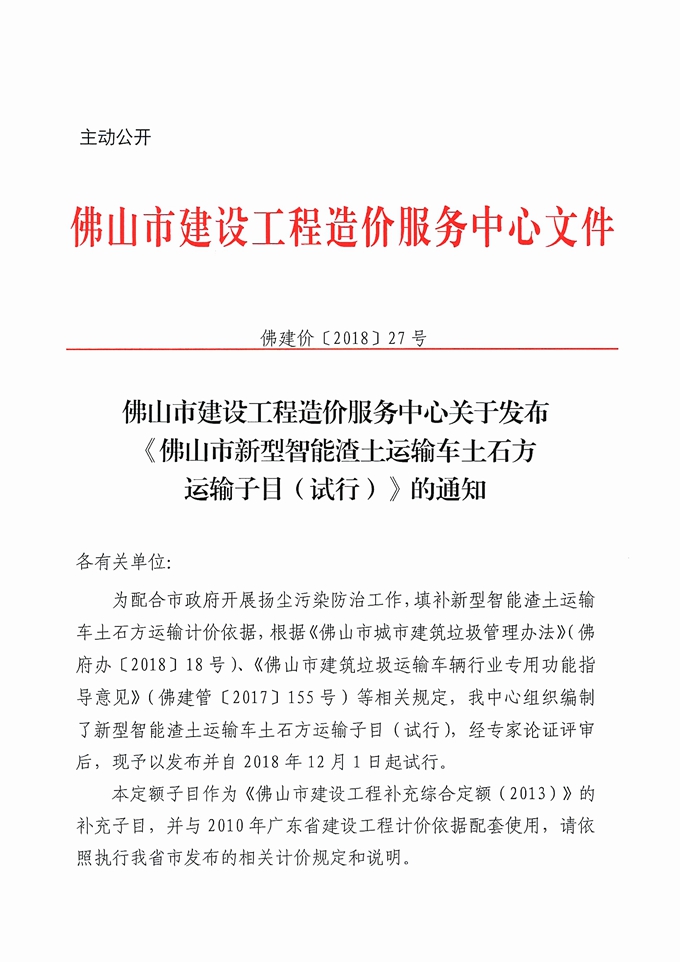 佛山市建設(shè)工程造價(jià)服務(wù)中心關(guān)于發(fā)布《佛山市新型智能渣土運(yùn)輸車土石方運(yùn)輸子目(試行)》的通知