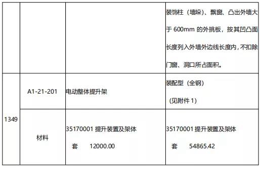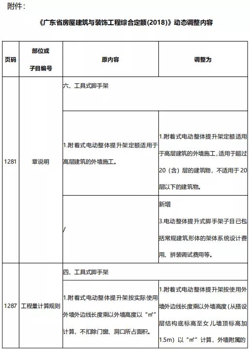近期,我站研究分析了廣東省建設工程定額動態管理系統收集的反饋意見,《廣東省房屋建筑與裝飾工程綜合定額(2018)》附著式電動整體提升架定額子目與市場實際水平存在一定差異。為加強定額動態管理,經廣泛調研,并征求建設各方意見,組織專題研究與測算,現對定額中附著式電動整體提升架進行調整。本調整內容與我省現行工程計價依據配套使用,現印發給你們,請遵照執行。在執行中遇到的問題,請及時反映。