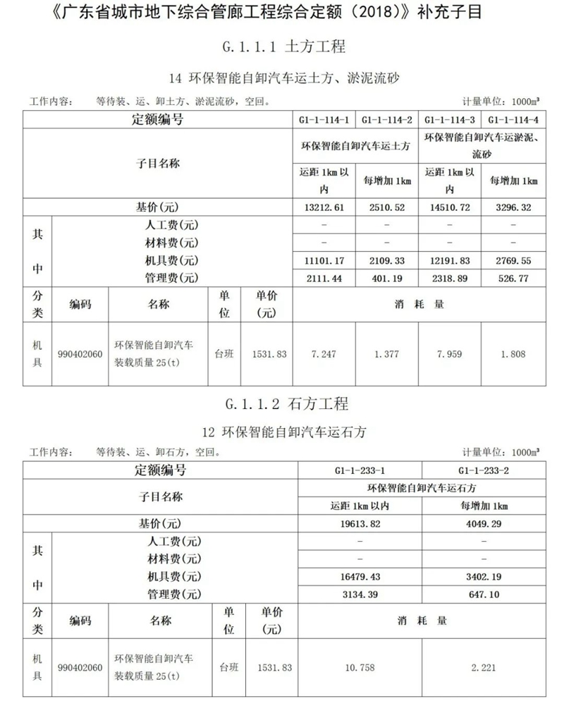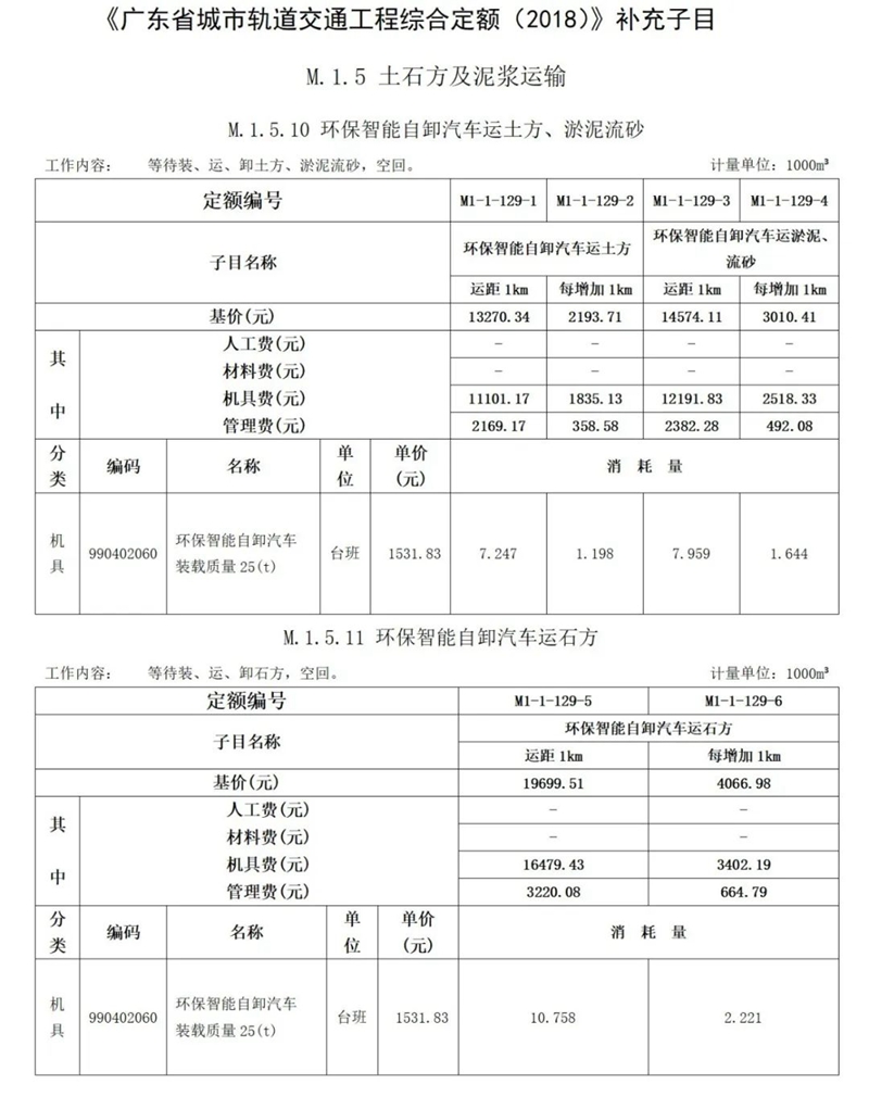 3.本補充定額子目機械臺班單價參照《廣東省建設工程施工機具臺班費用編制規則2018》“990402060 環保智能自卸汽車”計取;管理費參照《廣東省城市軌道交通工程綜合定額2018》《廣東省市政工程綜合定額2018》《廣東省城市地下綜合管廊工程綜合定額2018》“附錄二 管理費分攤費率表”中相關專業冊管理費分攤費率計取。