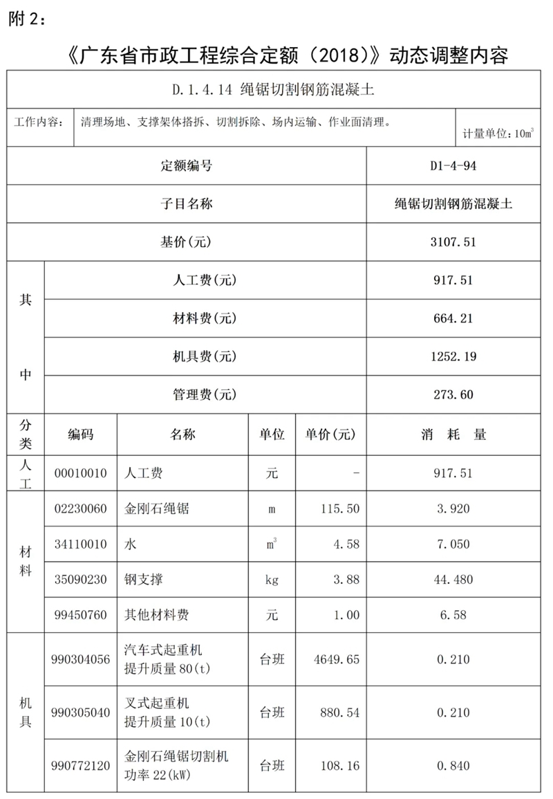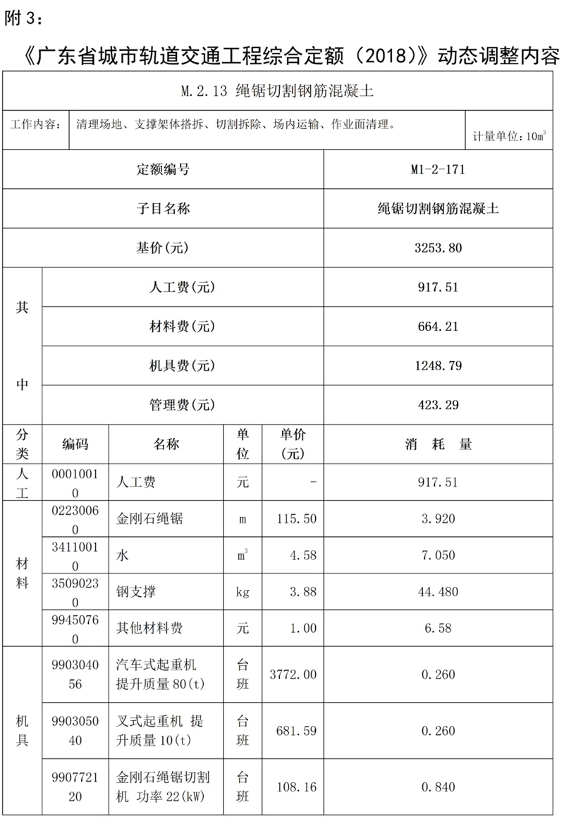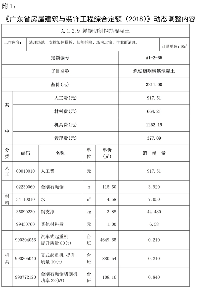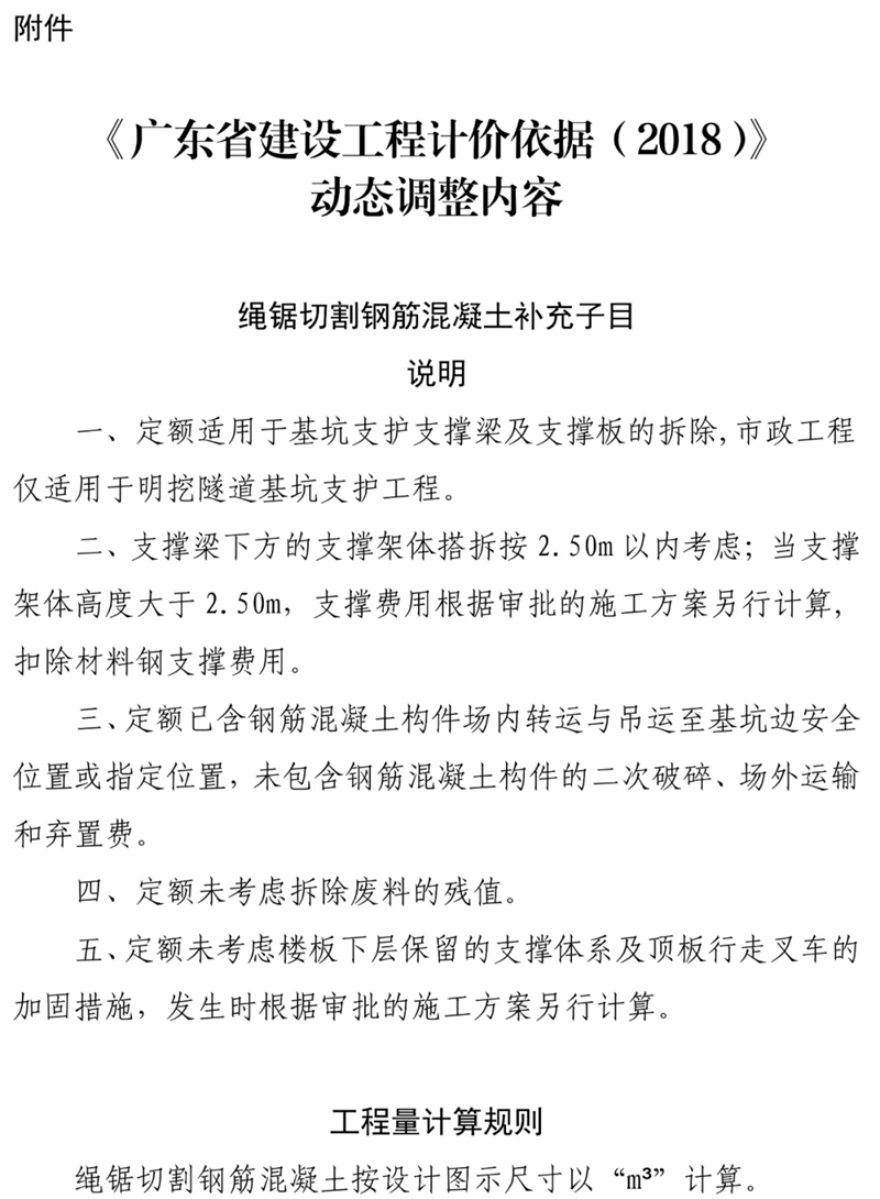 近期,我站組織專家研析了廣東省建設工程定額動態管理系統收集的反饋意見,補充《廣東省建設工程計價依據 (2018)》繩鋸切割鋼筋混凝土定額子目,現印發你們,請遵照執行。