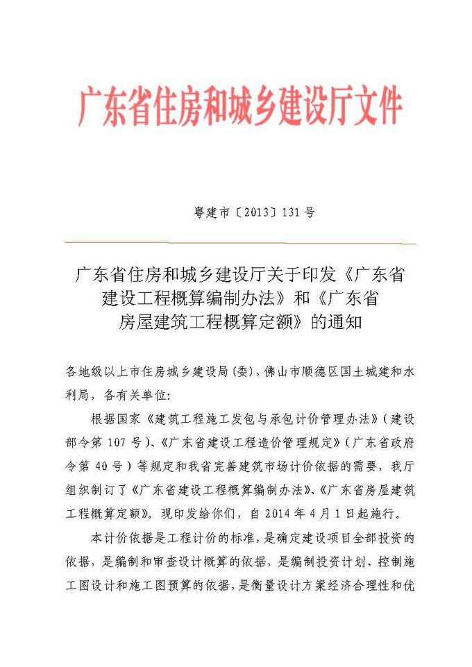 廣東省住房和城鄉(xiāng)建設廳關于印發(fā)《廣東省建設工程概算編制辦法》和《廣東省房屋建筑工程概算定額》的通知