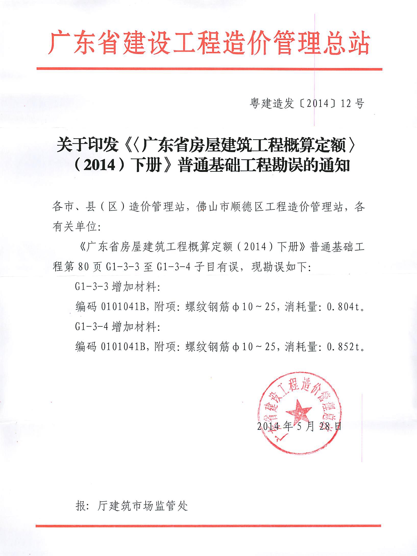關(guān)于印發(fā)《<廣東省房屋建筑工程概算定額>(2014)下冊(cè)》普通基礎(chǔ)工程勘誤的通知