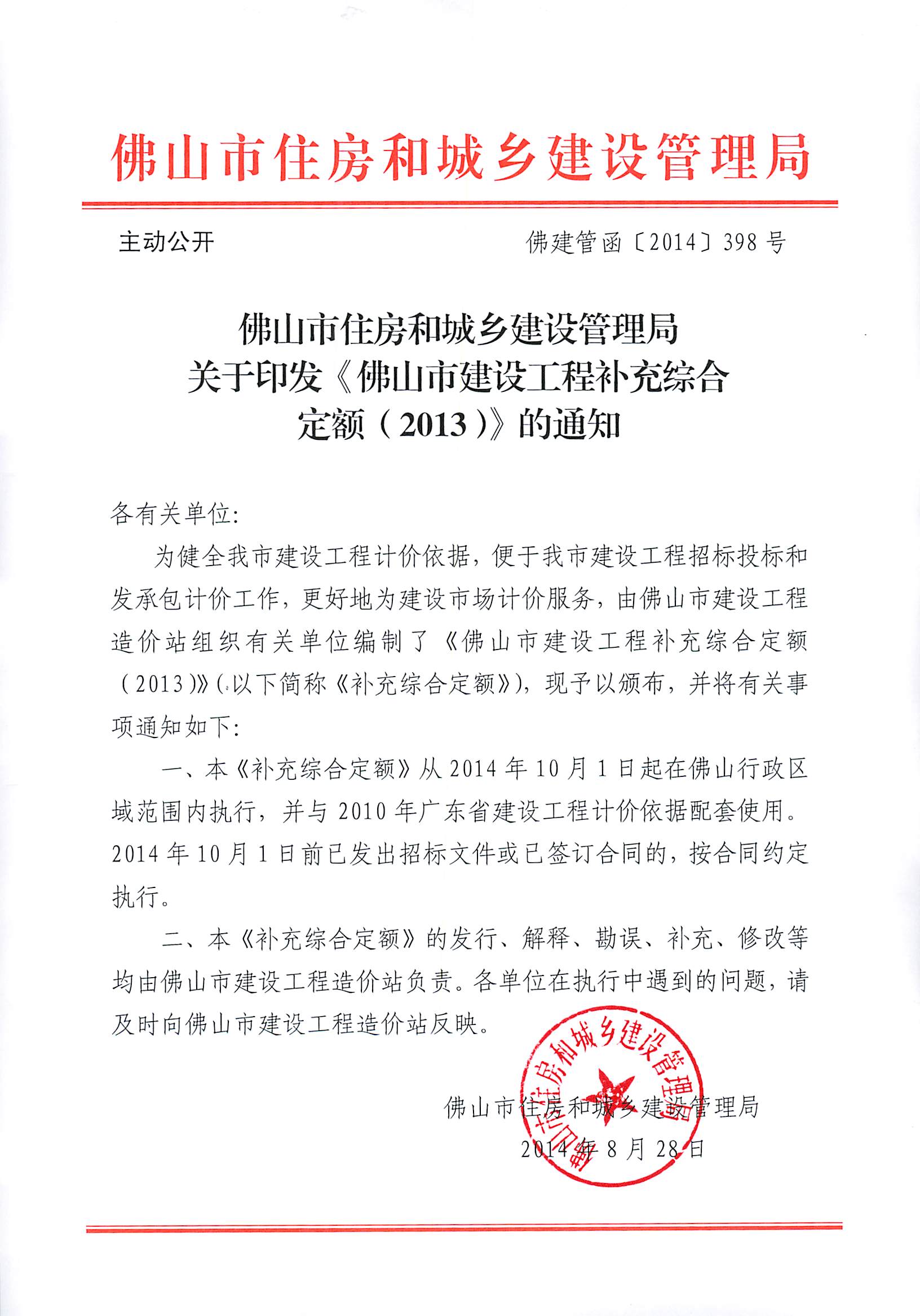佛山市住房和城鄉建設管理局關于印發《佛山市建設工程補充綜合定額(2013)》的通知
