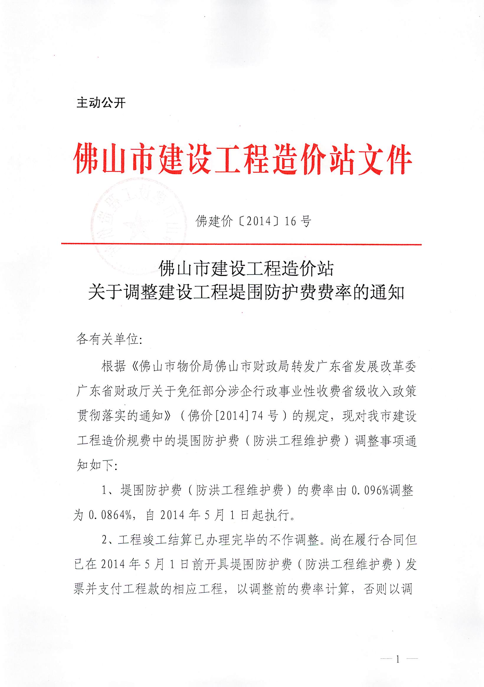 佛山市建設工程造價站關于調整建設工程堤圍防護費費率的通知