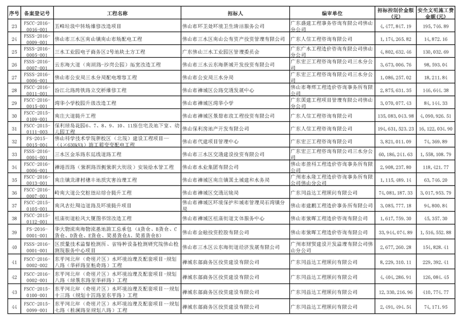 佛山市招標控制價備案情況表(2016-01-01至2016-03-31)