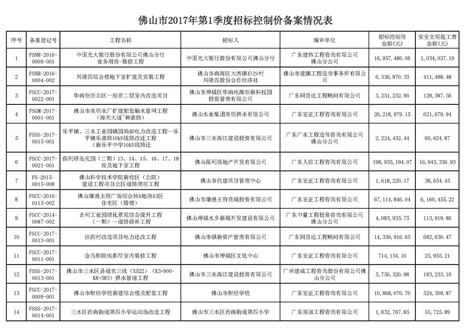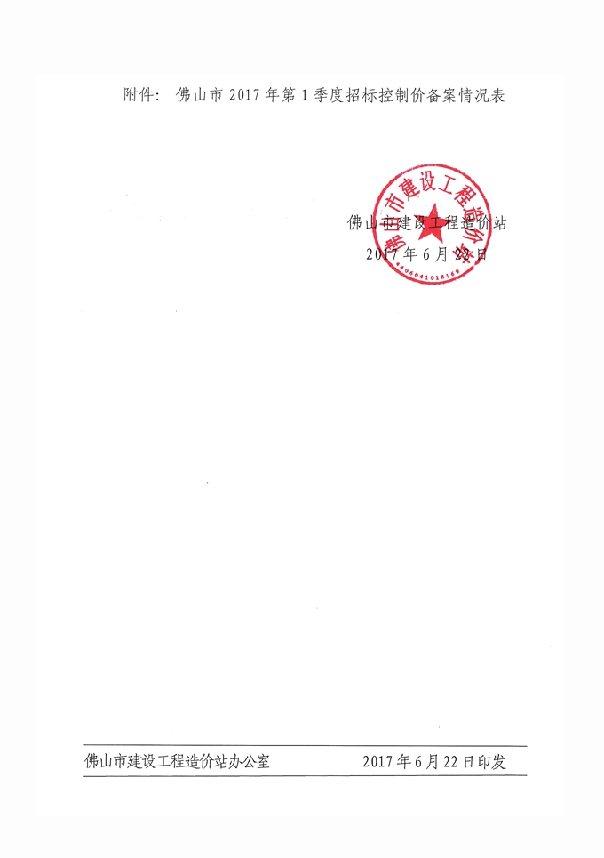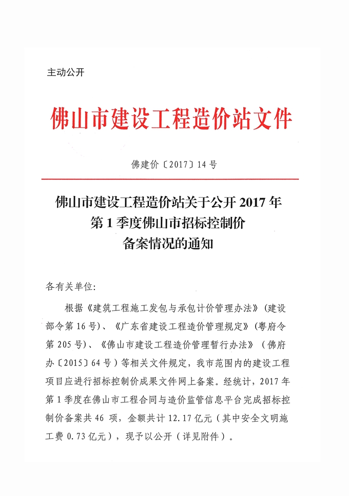 佛山市建設工程造價站關于公開2017年第1季度佛山市招標控制價備案情況的通知