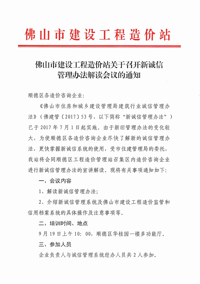 佛山市建設(shè)工程造價站關(guān)于召開新誠信管理辦法解讀會議的通知