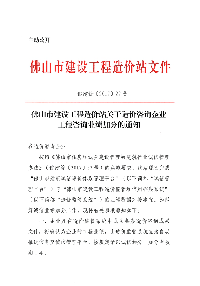 佛山市建設(shè)工程造價(jià)站關(guān)于造價(jià)咨詢企業(yè)工程咨詢業(yè)績加分的通知
