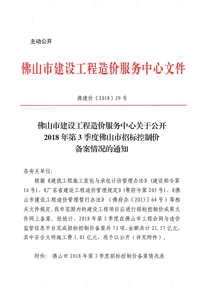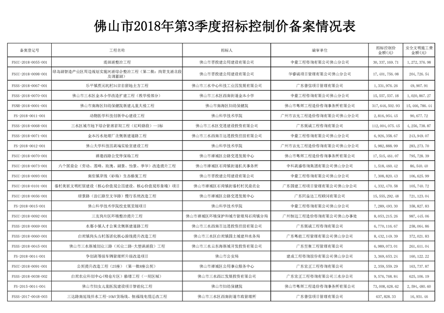 佛山市建設工程造價服務中心關于公布2018年第3季度佛山市招標控制價備案情況的通知