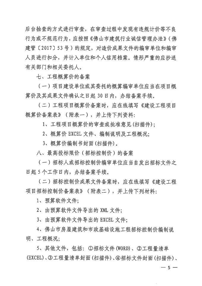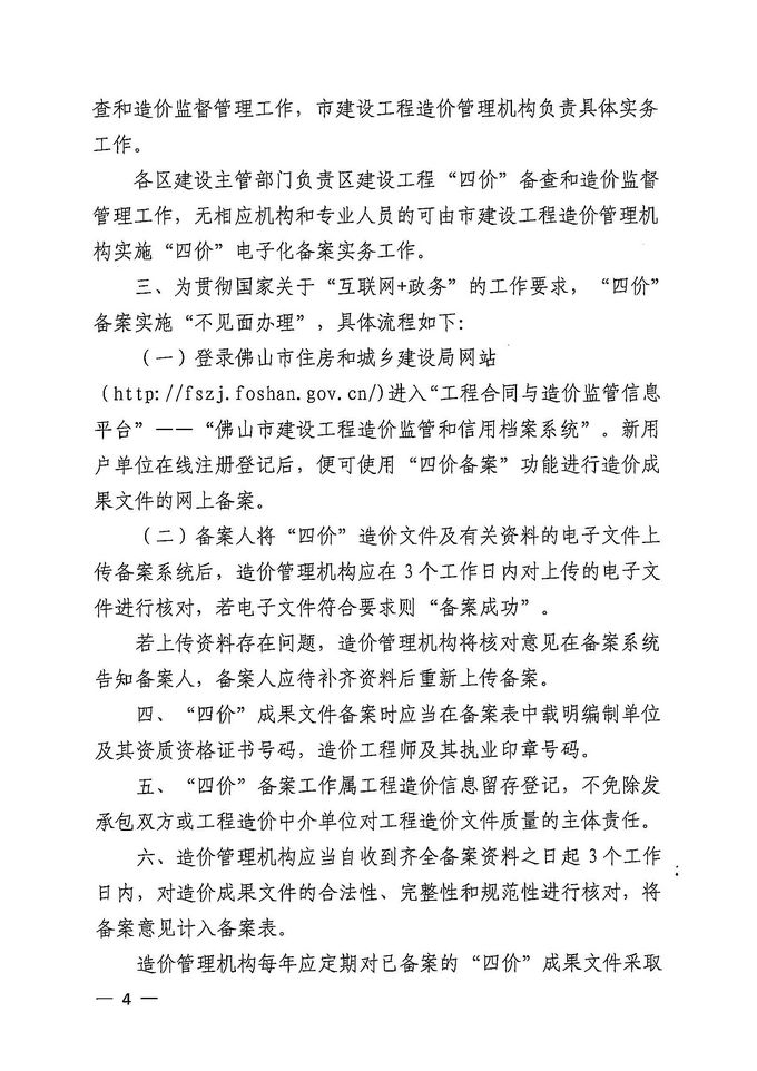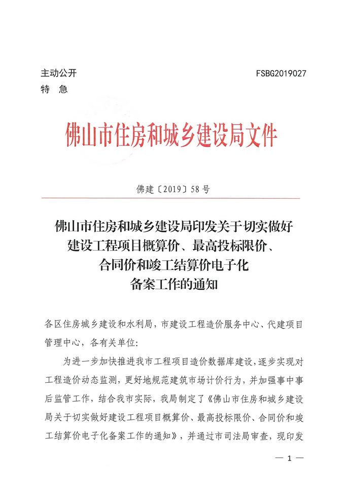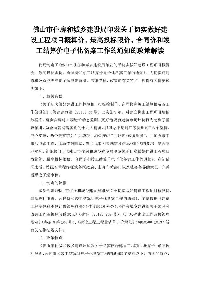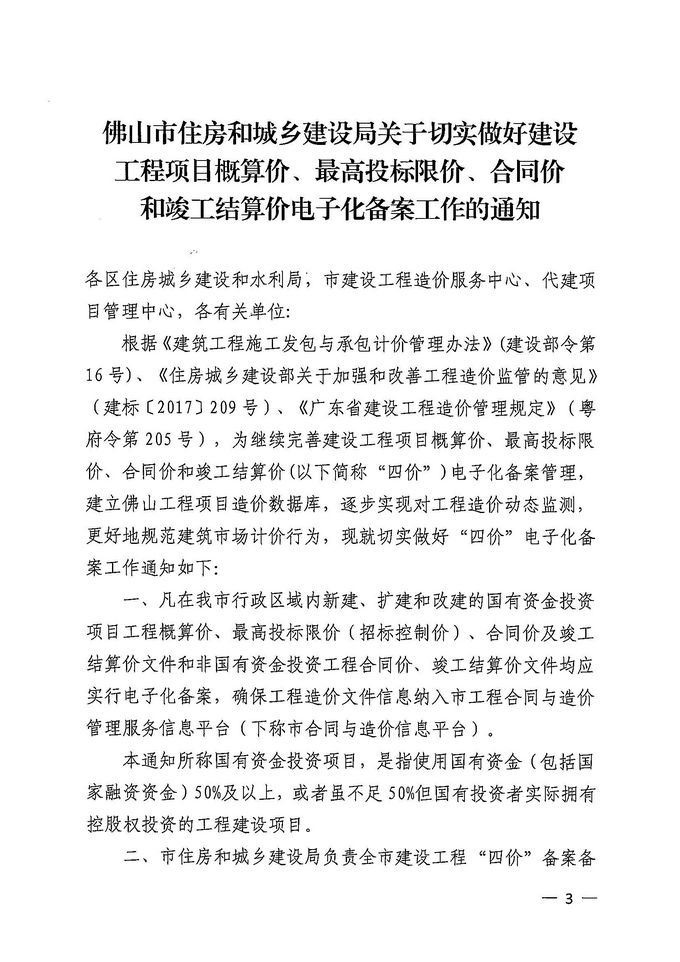佛山市住房和城鄉(xiāng)建設局印發(fā)關于切實做好建設工程項目概算價、最高投標限價、合同價和竣工結算價電子化備案工作的通知