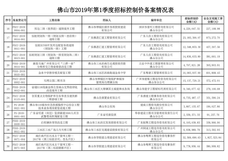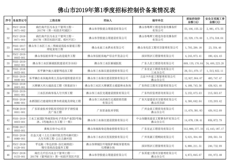 佛山市建設工程造價服務中心關于公布2019年第1季度佛山市招標控制價備案情況的通知