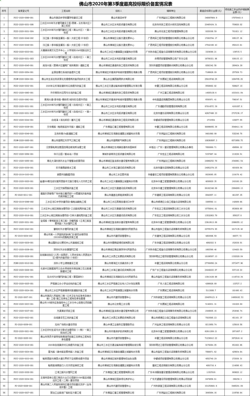 附件:佛山市2020年第3季度最高投標限價備案情況表
