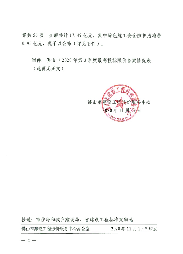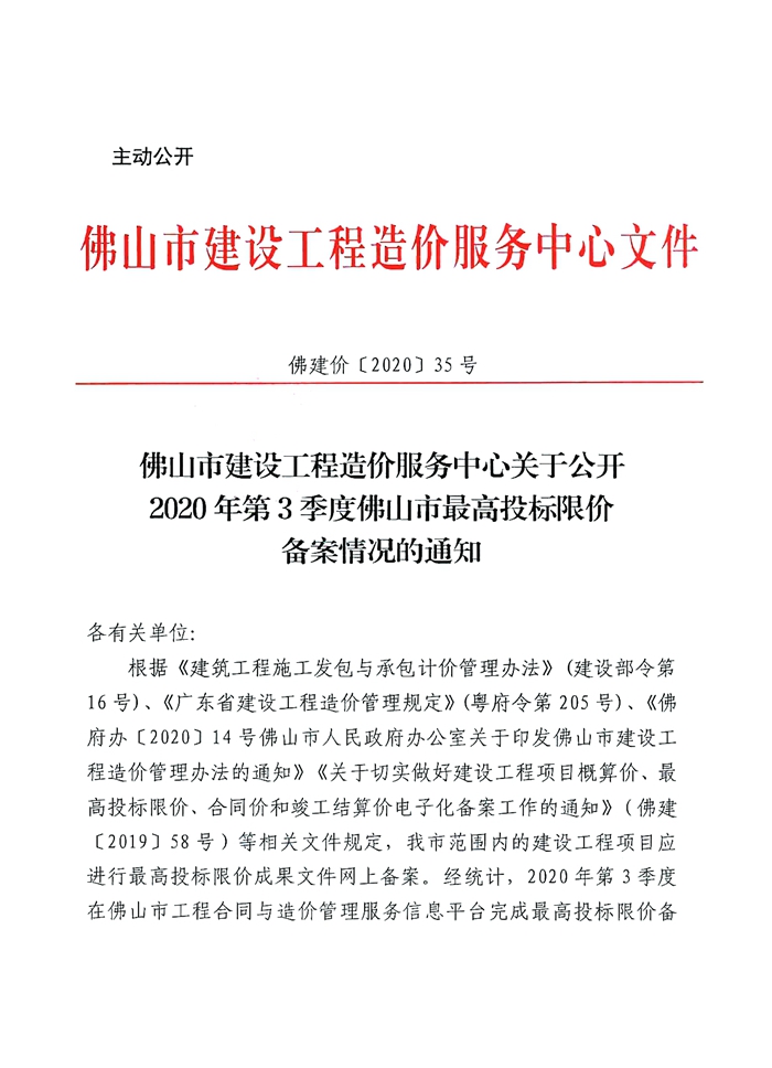 佛山市建設工程造價服務中心關于公開2020年第3季度佛山市最高投標限價備案情況的通知