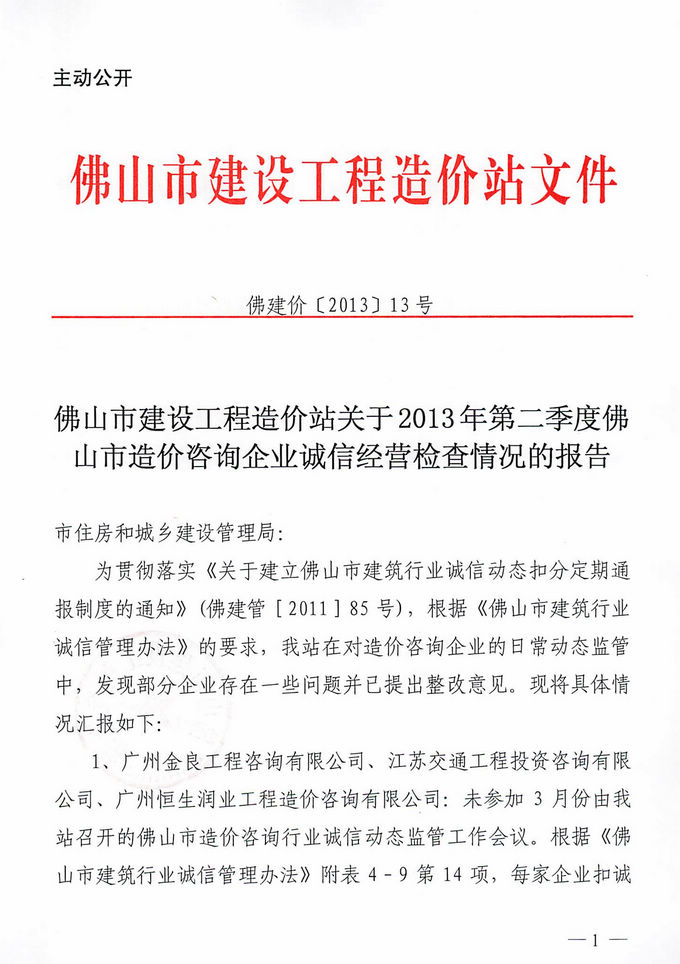 佛山市建設(shè)工程造價站關(guān)于2013年第二季度佛山市造價咨詢企業(yè)誠信經(jīng)營檢查情況的報告