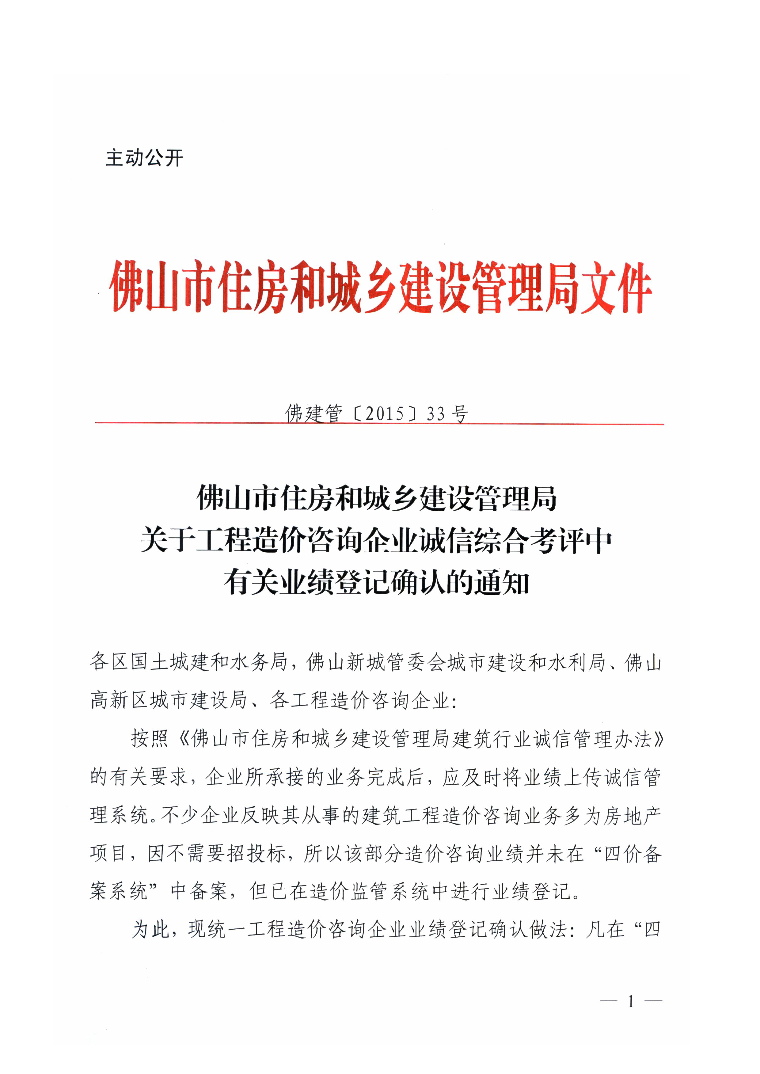佛山市住房和城鄉建設管理局關于工程造價咨詢企業誠信綜合考評中有關業績登記確認的通知