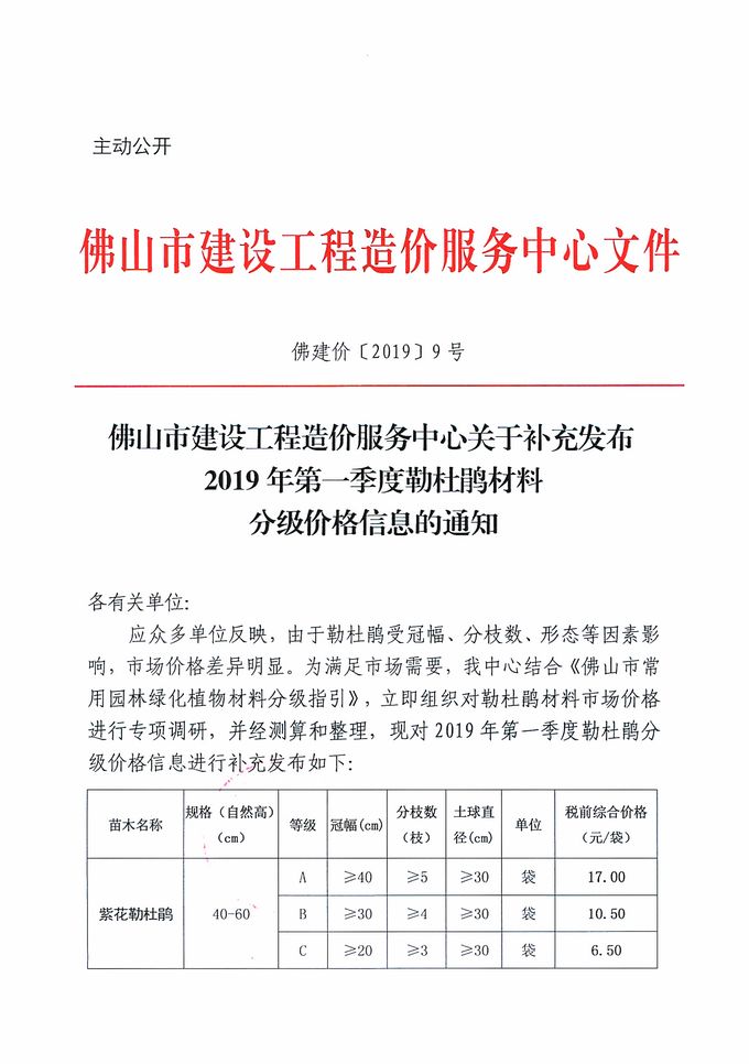 佛山市建設工程造價服務中心關于補充發布2019年第一季度勒杜鵑材料分級價格信息的通知