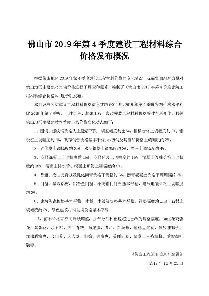佛山市2019年第4季度建設工程材料綜合價格發布概況
