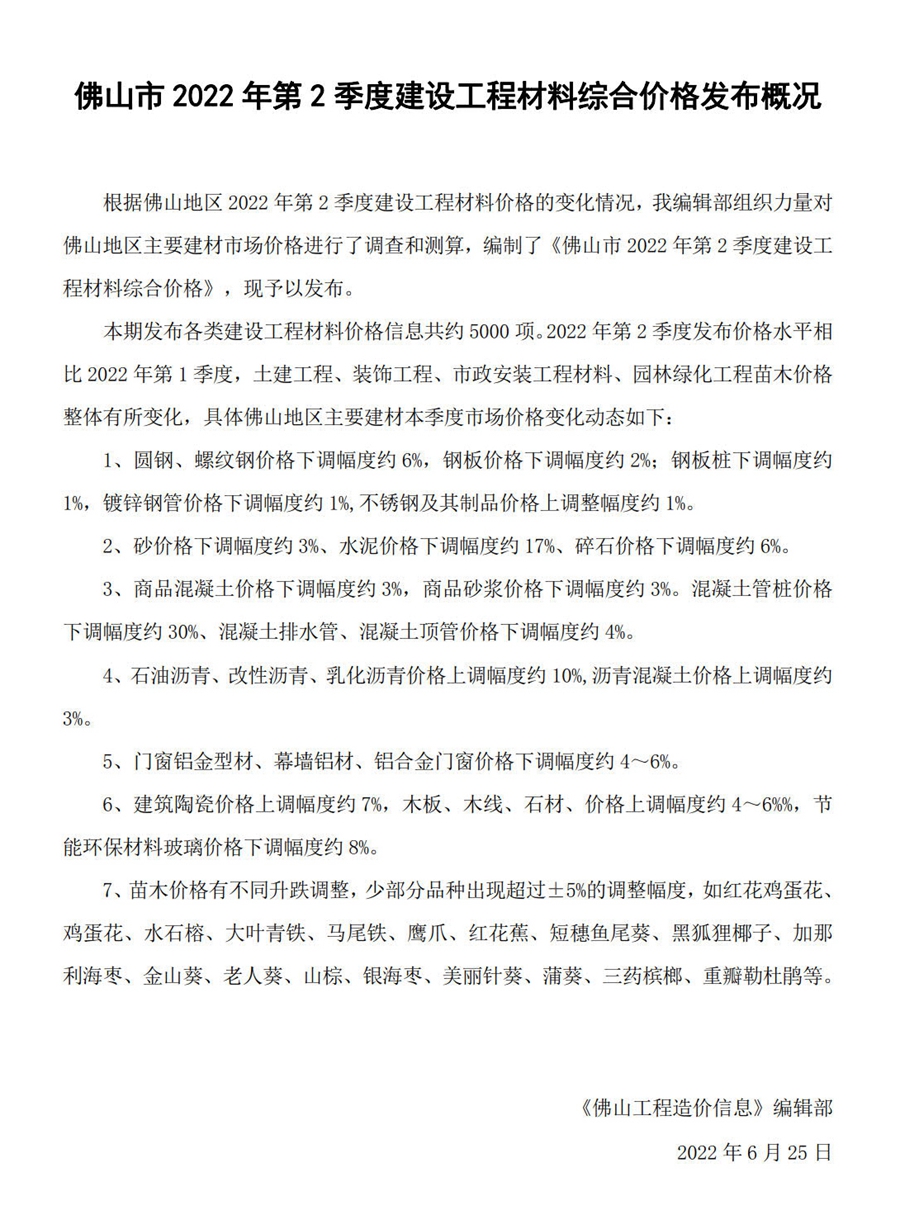 佛山市2022年第2季度建設工程材料綜合價格發布概況