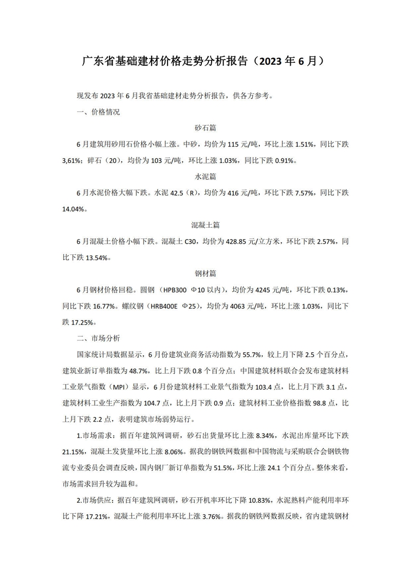 轉發 | 廣東省基礎建材價格走勢分析報告(2023年6月)