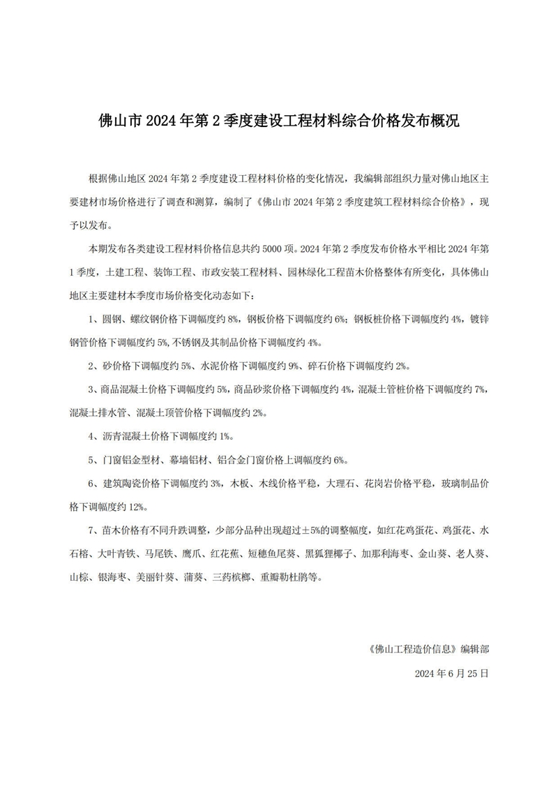 佛山市2024年第2季度建設工程材料綜合價格發布概況