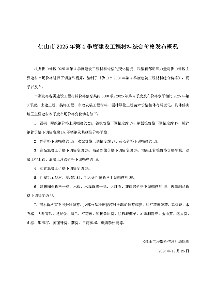 佛山市2025年第4季度建設(shè)工程材料綜合價格發(fā)布概況