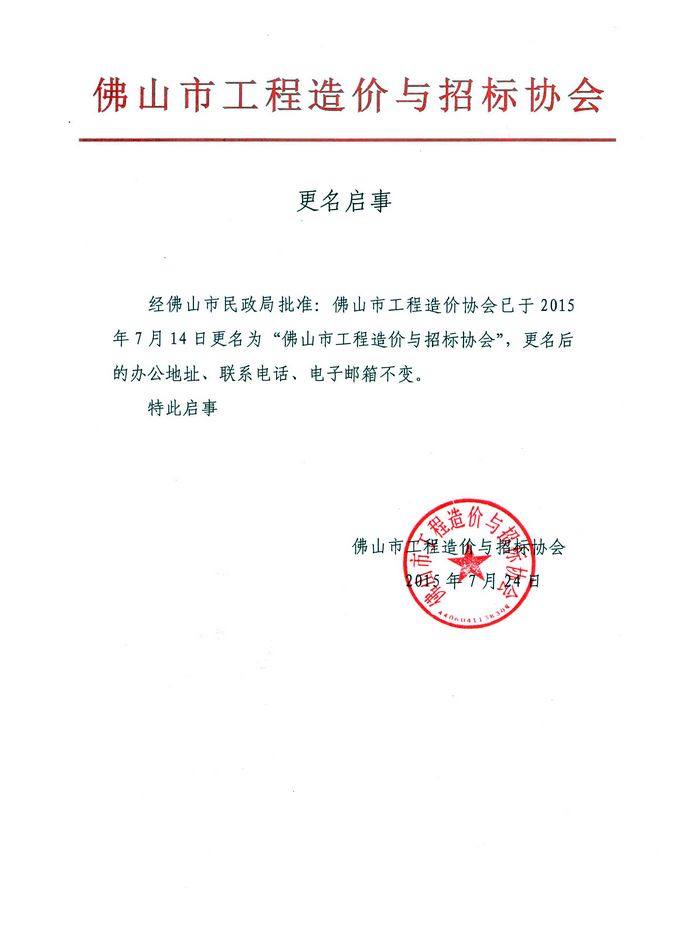 佛山市工程造價(jià)與招標(biāo)協(xié)會(huì)更名啟事
