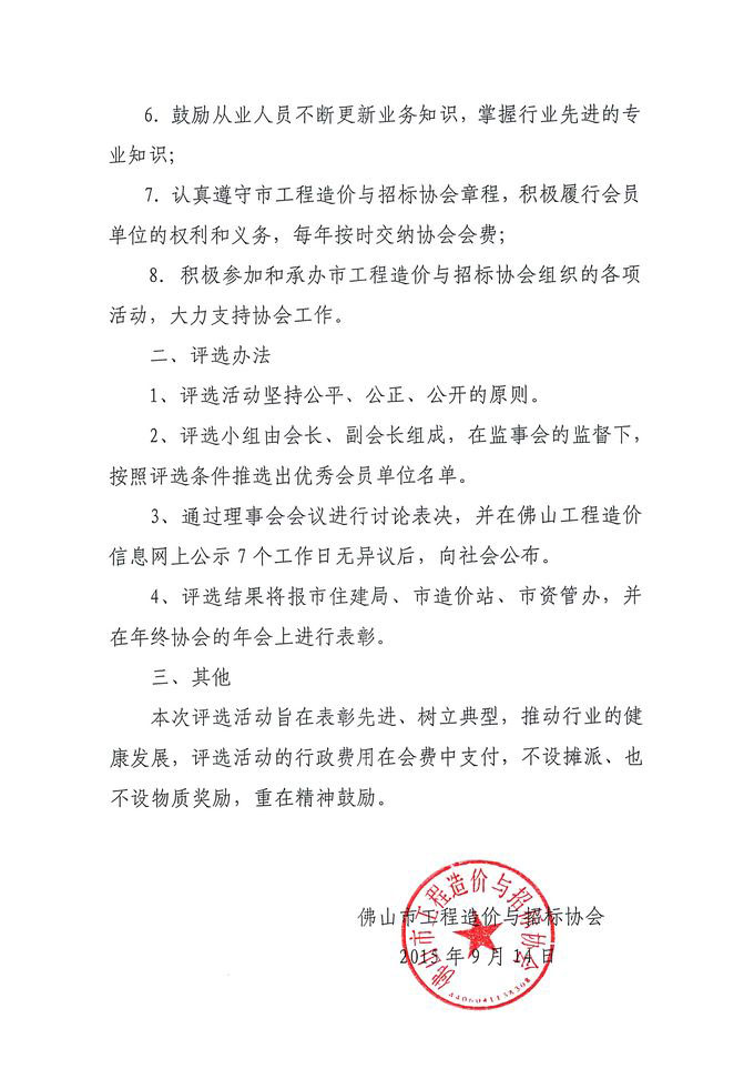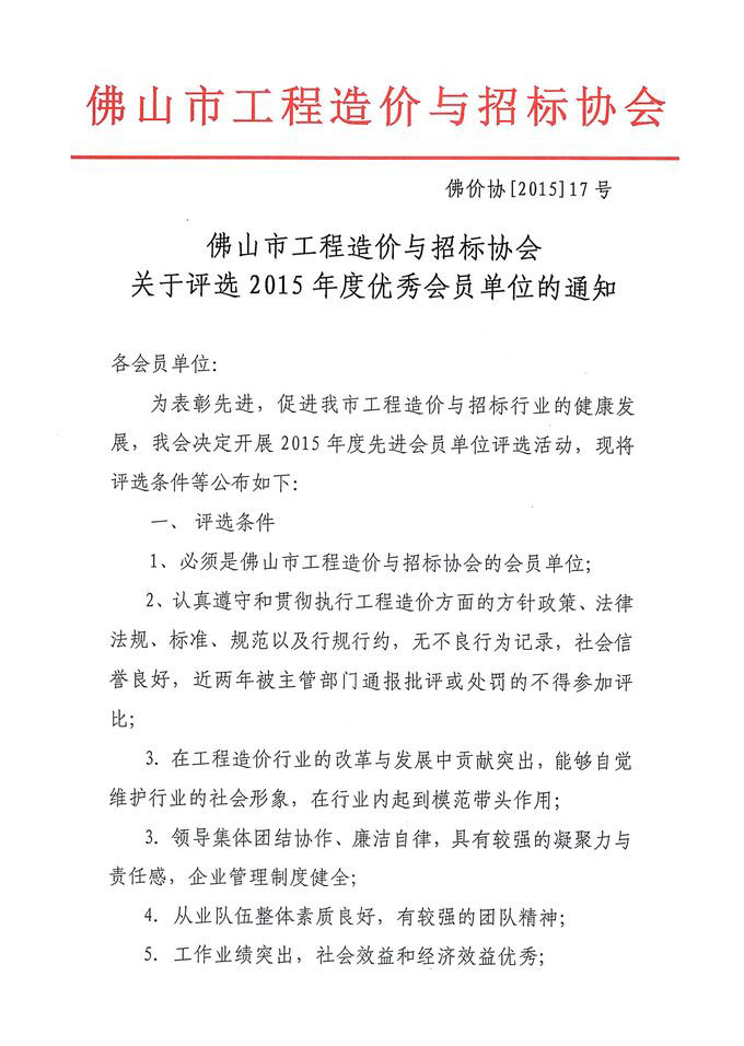 佛山市工程造價與招標(biāo)協(xié)會關(guān)于評選2015年度優(yōu)秀會員單位的通知