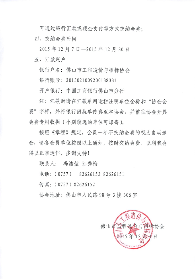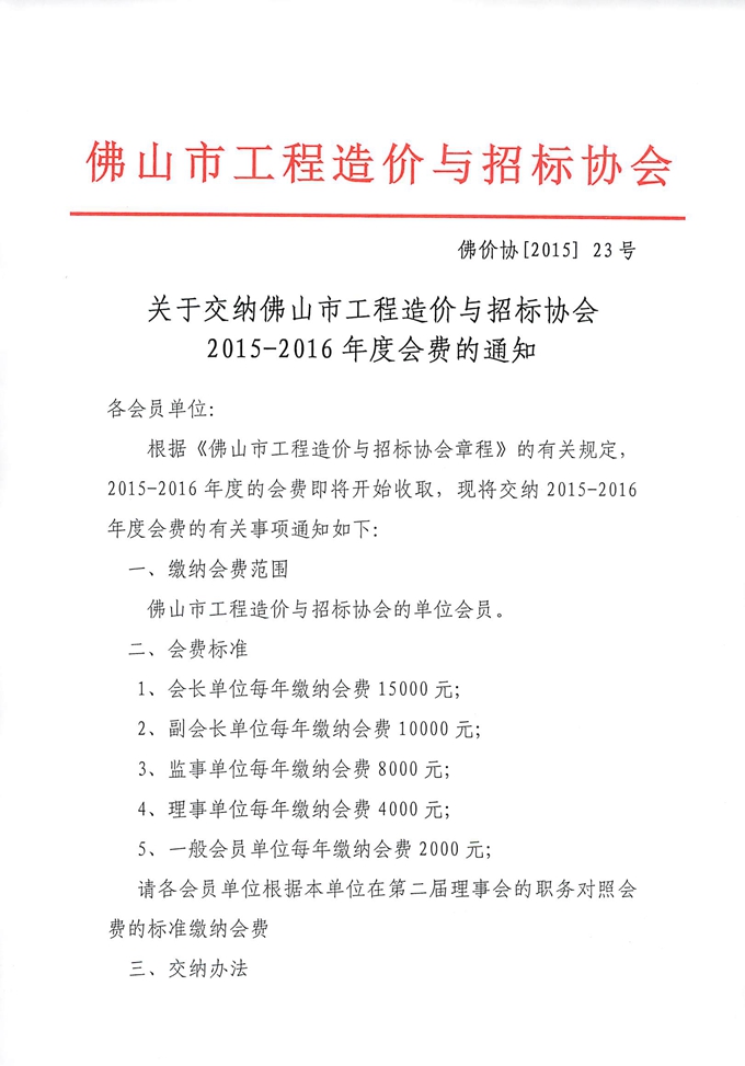 關(guān)于交納佛山市工程造價(jià)與招標(biāo)協(xié)會(huì)2015-2016年度會(huì)費(fèi)的通知