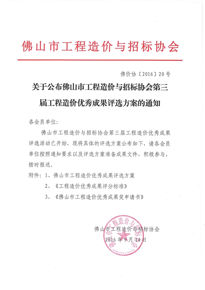關于公布佛山市工程造價與招標協會第三屆工程造價優秀成果評選方案的通知