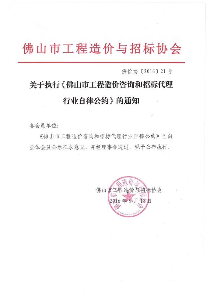 關于執行《佛山市工程造價咨詢和招標代理行業自律公約》的通知