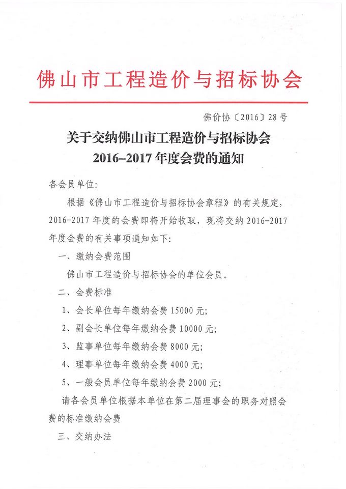 關于交納佛山市工程造價與招標協會2016-2017年度會費的通知