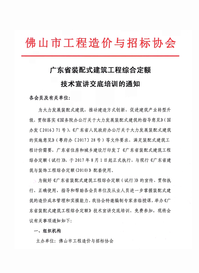 廣東省裝配式建筑工程綜合定額技術宣講交底培訓的通知