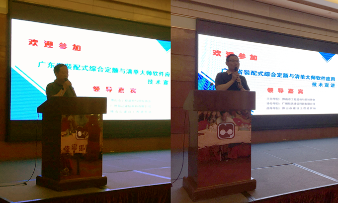 (廣東省建設工程造價管理總站黃中廣科長(左)、佛山市建設工程造價站余建平站長(右)發表重要講話)