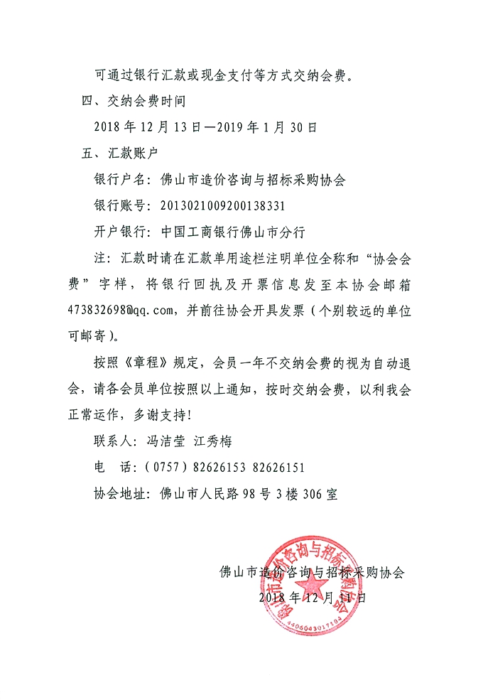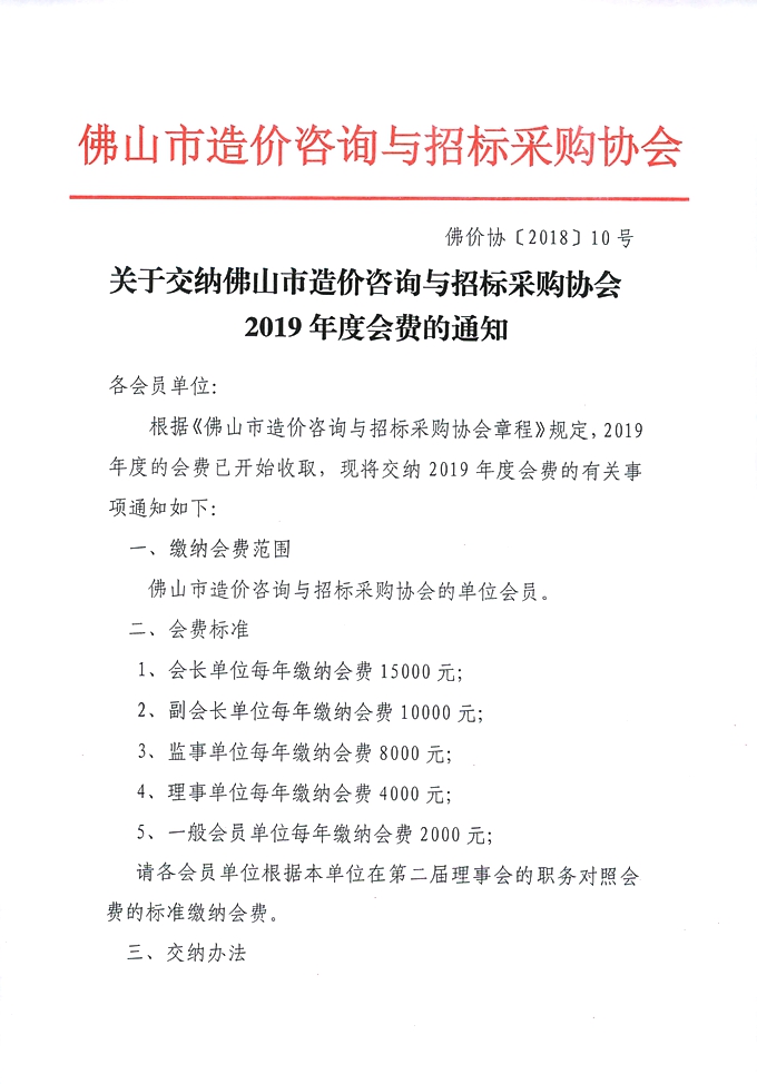 關于交納佛山市造價咨詢與招標采購協會2019年度會費的通知