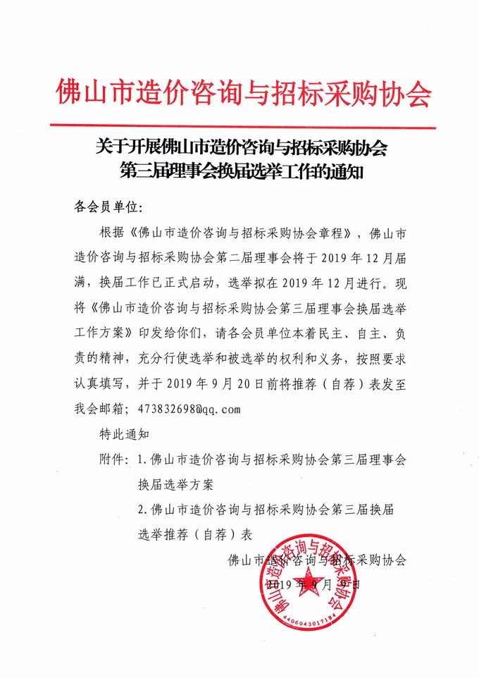 關(guān)于開展佛山市造價咨詢與招標(biāo)采購協(xié)會第三屆理事會換屆選舉工作的通知