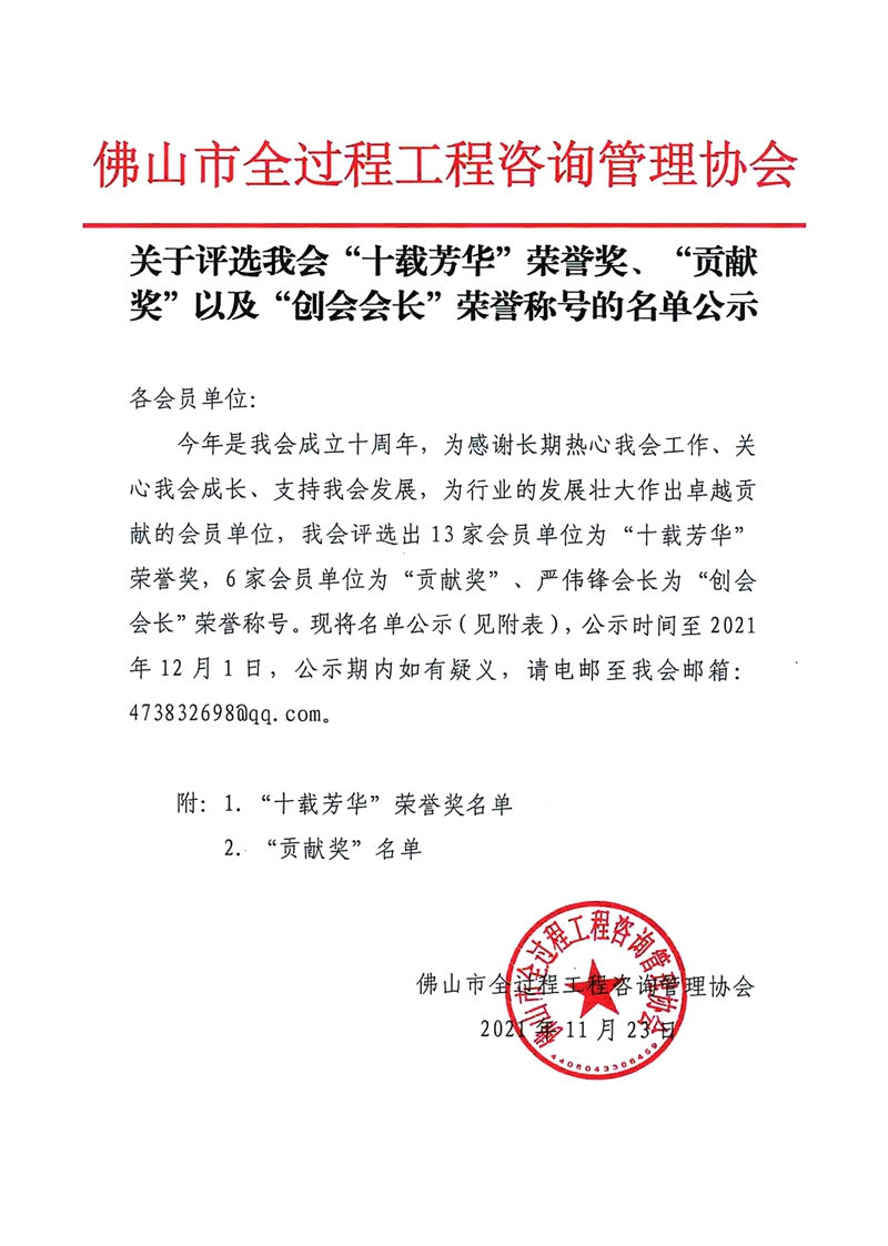 關于評選我會“十載芳華”榮譽獎、“貢獻獎”以及“創會會長”榮譽稱號的名單公示