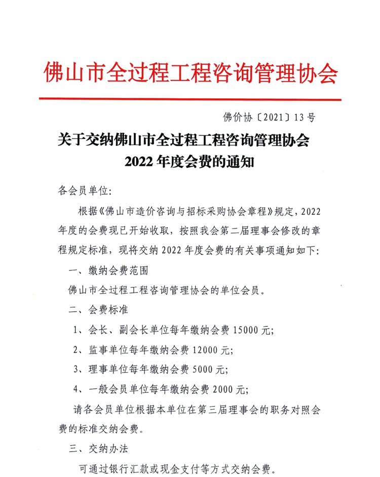 關于交納佛山市全過程工程咨詢管理協會2022年度會費的通知