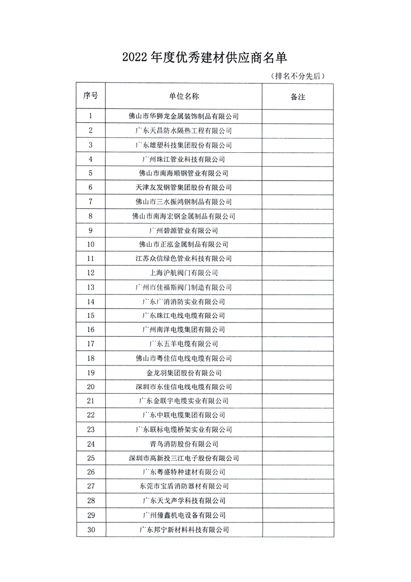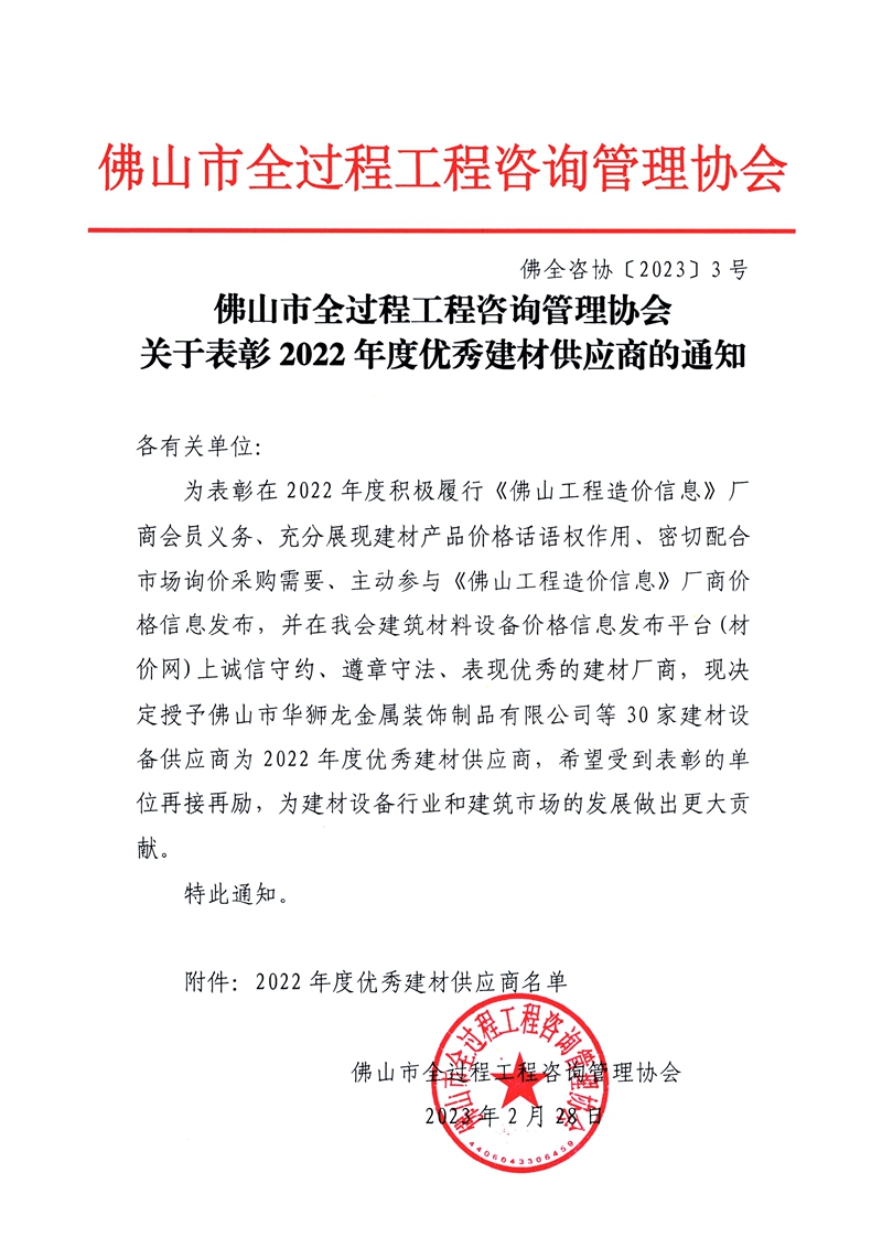 佛山市全過程工程咨詢管理協(xié)會關(guān)于表彰2022年度優(yōu)秀建材供應(yīng)商的通知