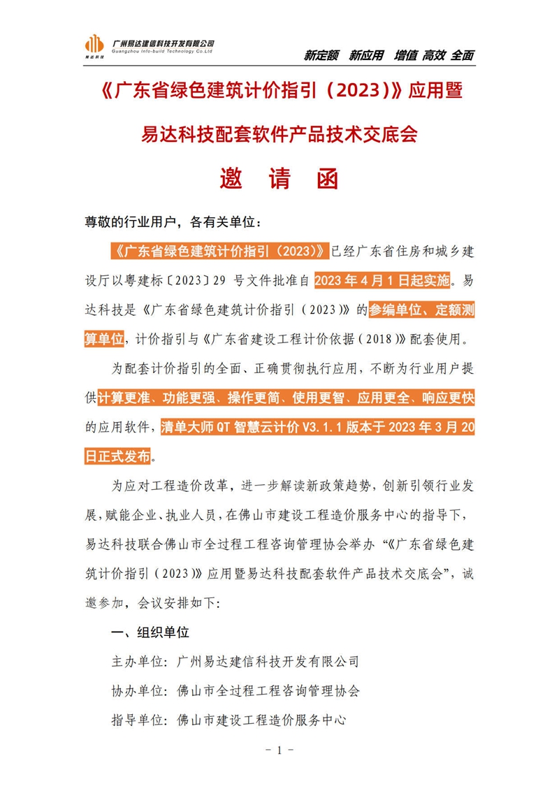 《廣東省綠色建筑計(jì)價(jià)指引(2023)》應(yīng)用暨易達(dá)科技配套軟件產(chǎn)品技術(shù)交底會(huì)邀請(qǐng)函