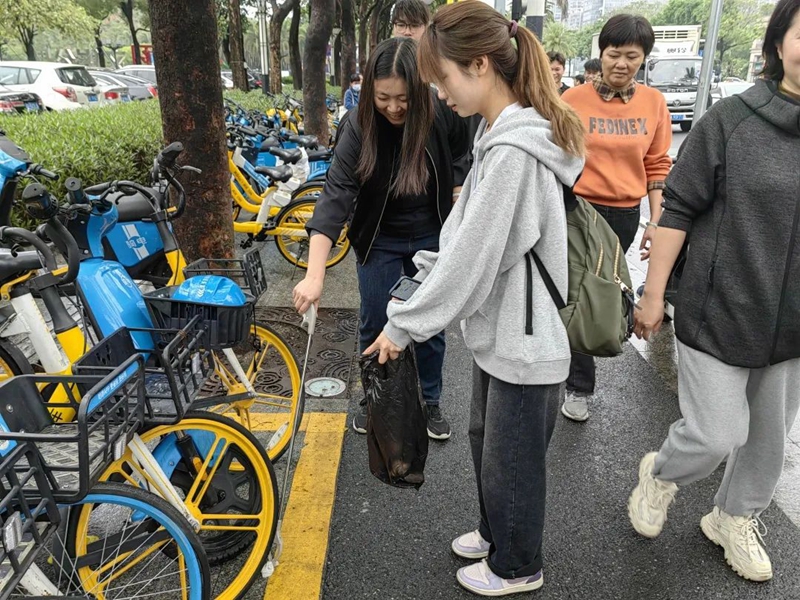 在行進過程中,參加活動的大家開啟另一重身份——環保公益志愿者,志愿者們拿著垃圾夾,將市民丟棄的垃圾,大的如塑料瓶、包裝袋,小的如煙頭、紙屑,全部裝入垃圾袋中,扶正被風雨吹倒的共享自行車,以實際行動宣傳垃圾分類、保護生態、創建文明城市的理念,倡導節能減排、低碳出行,為佛山打造綠色宜居環境貢獻社會組織的一份力量。