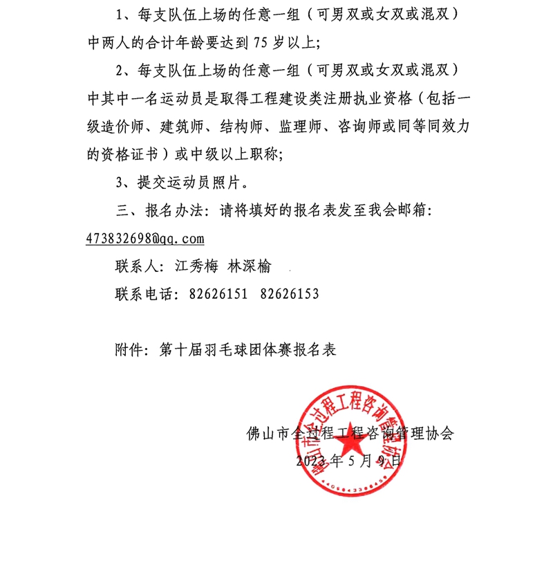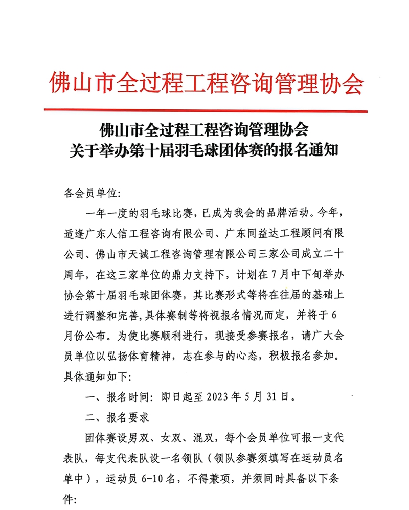 佛山市全過(guò)程工程咨詢管理協(xié)會(huì)關(guān)于舉辦第十屆羽毛球團(tuán)體賽的報(bào)名通知