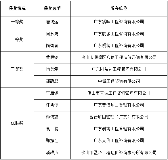 頒獎典禮前,佛山市建設工程造價服務中心主任余建平對參賽選手表現出強烈的競爭意識和高漲的參賽熱情表示肯定,并表示,本次大賽促進了行業業務交流,加快了新一代人才梯隊成長,推動了傳統的造價改革,讓各企業向全過程咨詢發展,對于佛山高質量人才發展起到了重要的作用,對大賽的圓滿舉辦表示衷心的祝賀。