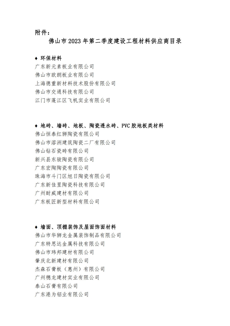 關于公布佛山市2023年第二季度建設工程材料供應商目錄的通知