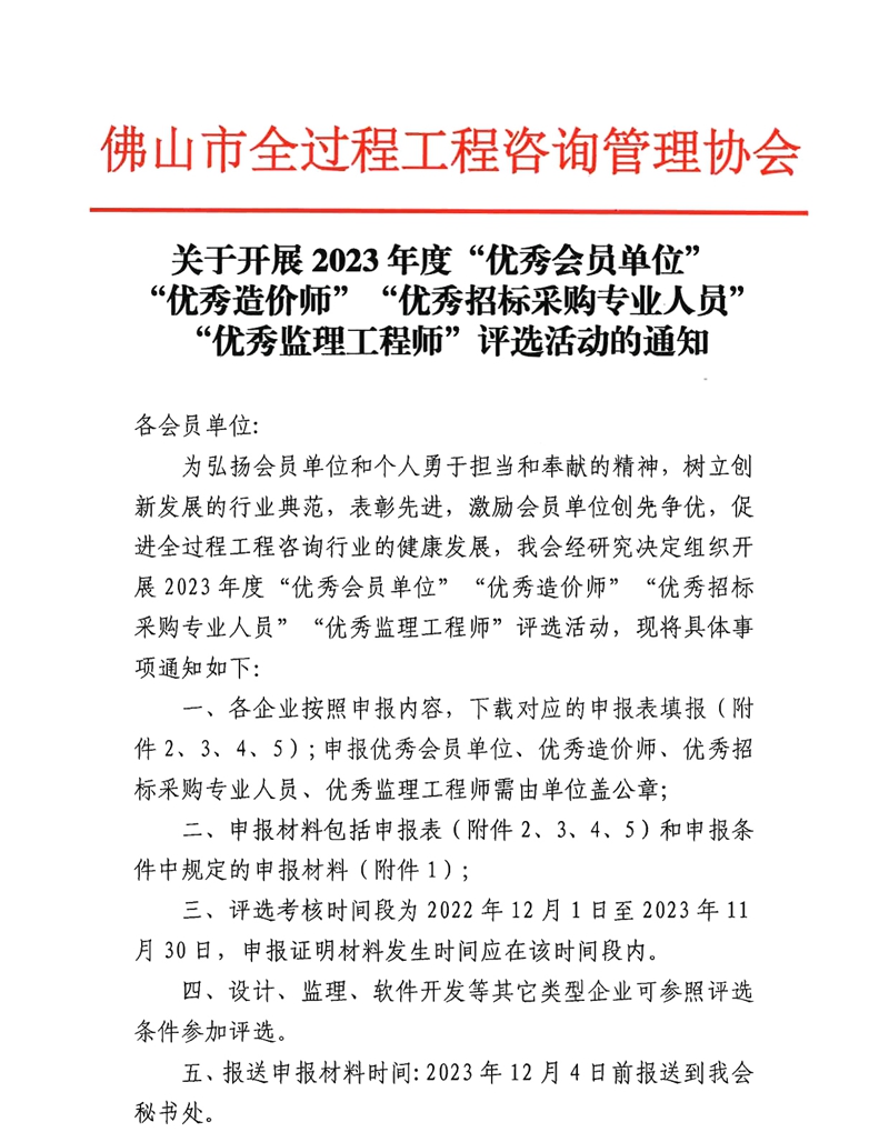 關(guān)于開(kāi)展2023年度“優(yōu)秀會(huì)員單位”“優(yōu)秀造價(jià)師”“優(yōu)秀招標(biāo)采購(gòu)專業(yè)人員”“優(yōu)秀監(jiān)理工程師”評(píng)選活動(dòng)的通知