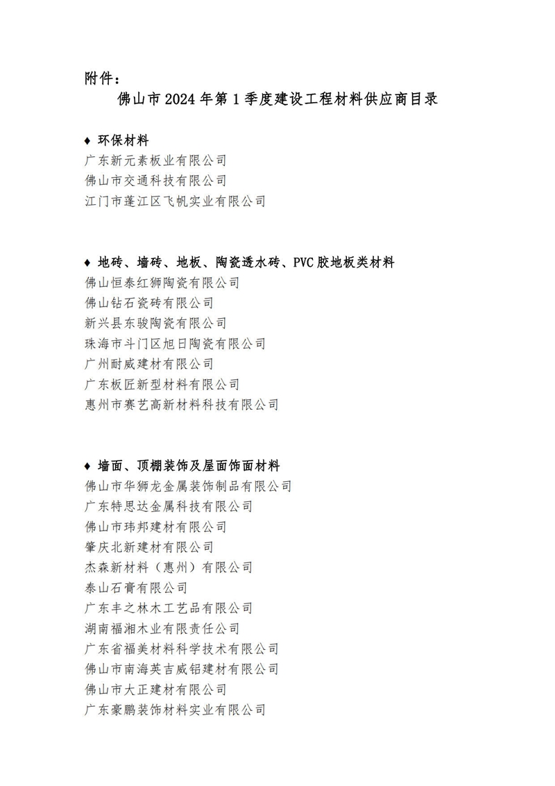 關于公布佛山市2024年第1季度建設工程材料供應商目錄的通知