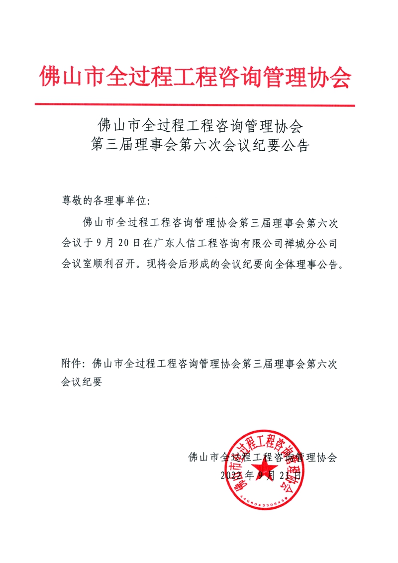 佛山市全過程工程咨詢管理協會第三屆理事會第六次會議紀要公告
