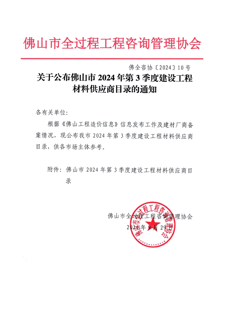 關于公布佛山市2024年第3季度建設工程材料供應商目錄的通知