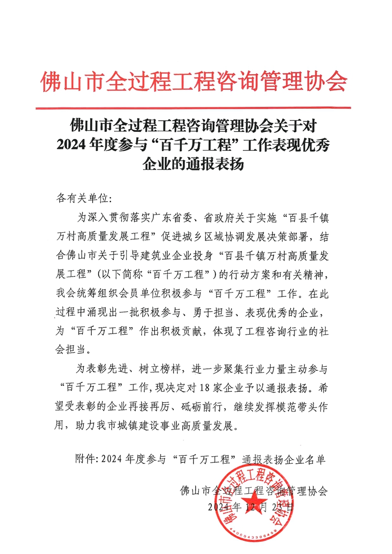 佛山市全過程工程咨詢管理協會關于對2024年度參與“百千萬工程”工作表現優秀企業的通報表揚