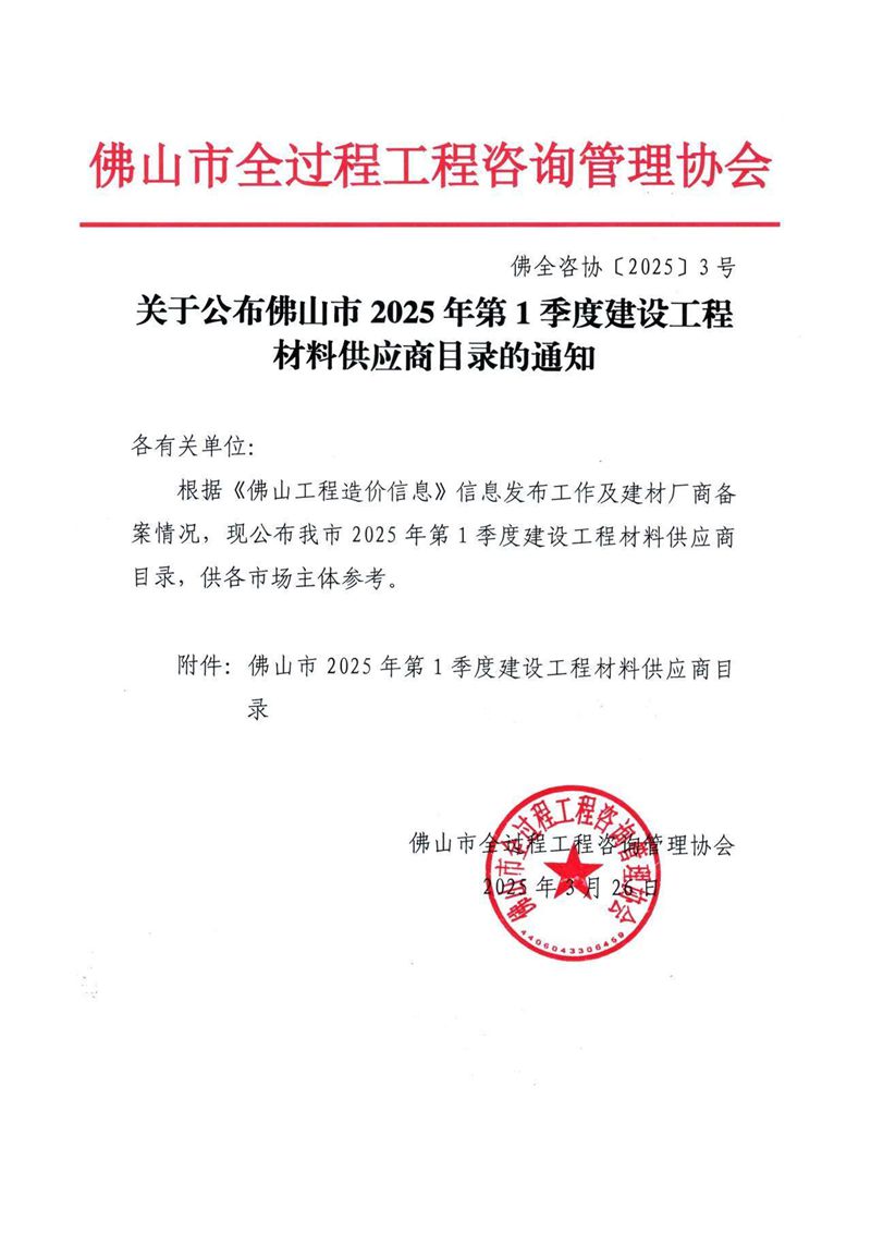 關(guān)于公布佛山市2025年第1季度建設(shè)工程材料供應(yīng)商目錄的通知